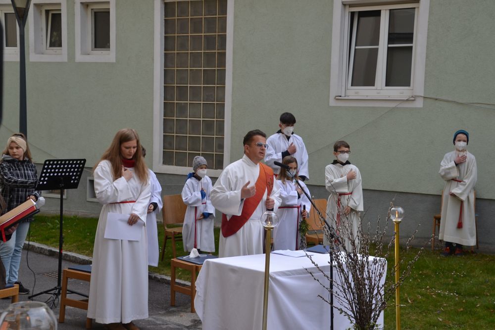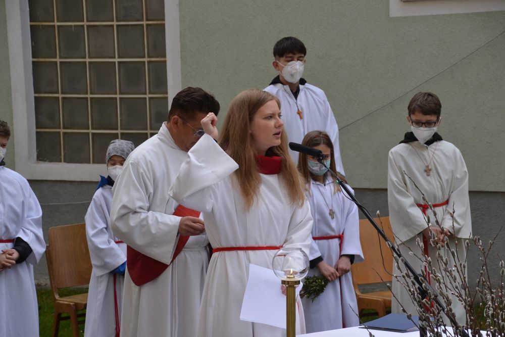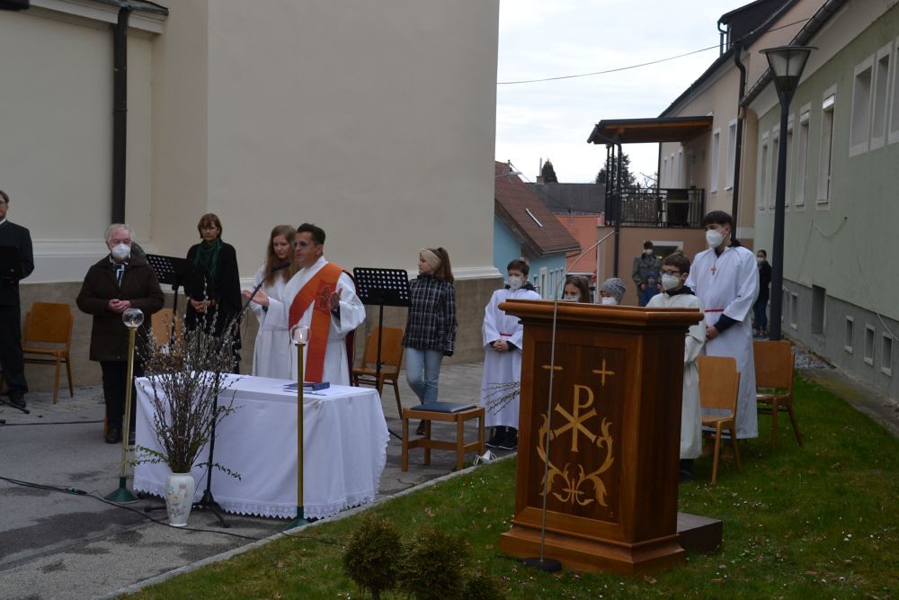 Diakon Wolfgang und Pastoralpraktikantin Anja feierten mit vielen Gottesdienstbesuchern eine Wortgottesfeier und segneten die  Palmzweige. Volksschulkinder unter der Leitung ihrer Lehrerin Andrea lasen die Leidensgeschichte.